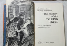 Alfred Hitchcock And The Three Investigators in The Mystery Of The Talking Skull, no. 11 in the series. Text by Robert Arthur, illustrated by Harry Kane. 179 printed pages. Hardcover. Publisher: Random House, copyright 1969. Library of Congress card catalog number 69-20274.