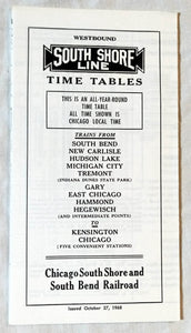 Chicago South Shore And South Bend Railroad (CSS) 1968 South Shore Line Time Tables for the Chicago to South Bend and intermediate points branch. The timetable was issued October 27, 1968