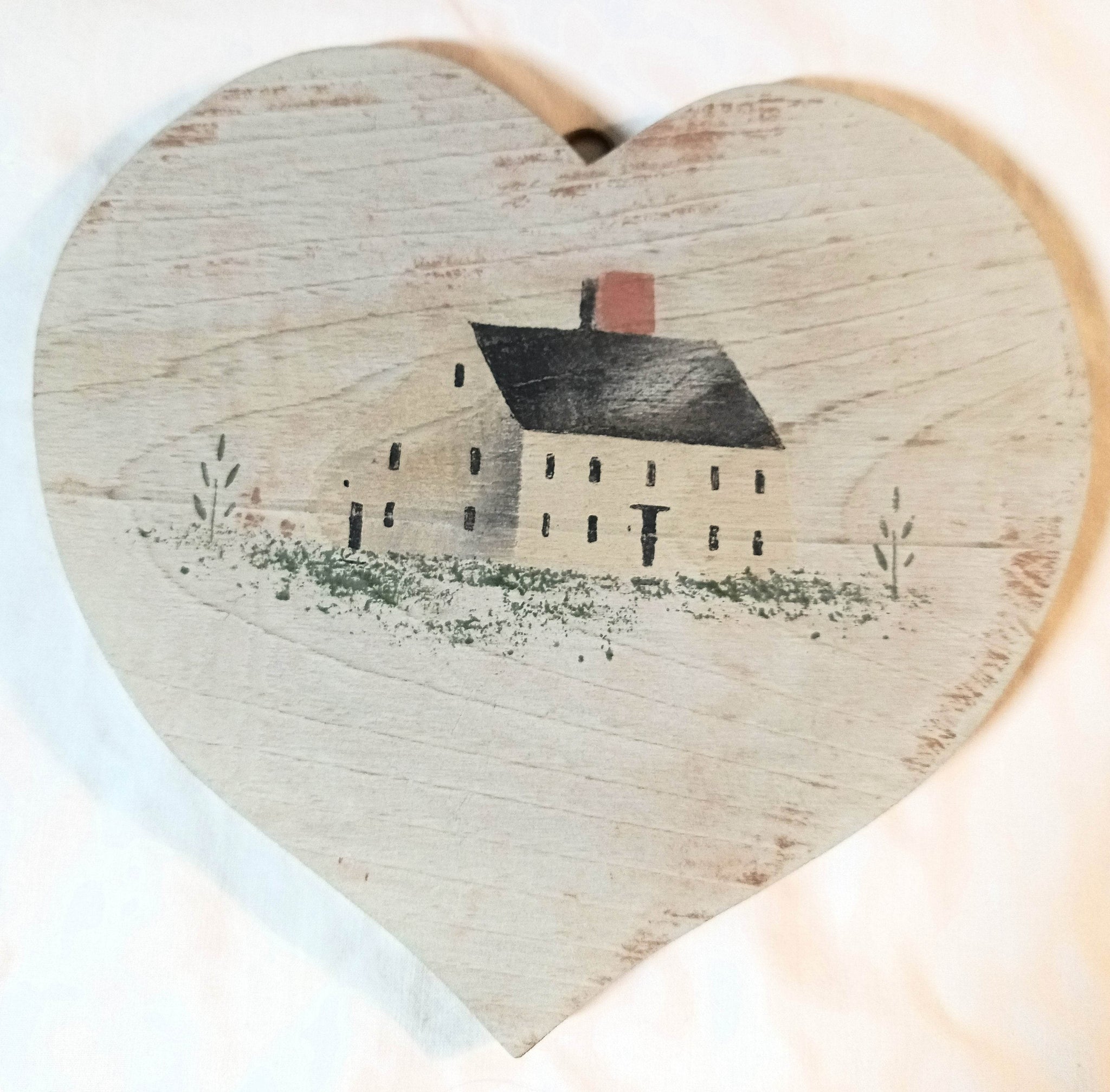 Christopher Gurshin Folk Art Wooden Heart Plaque – Early 1980s Primitive House Painting signed w/ artist's Pig Stamp