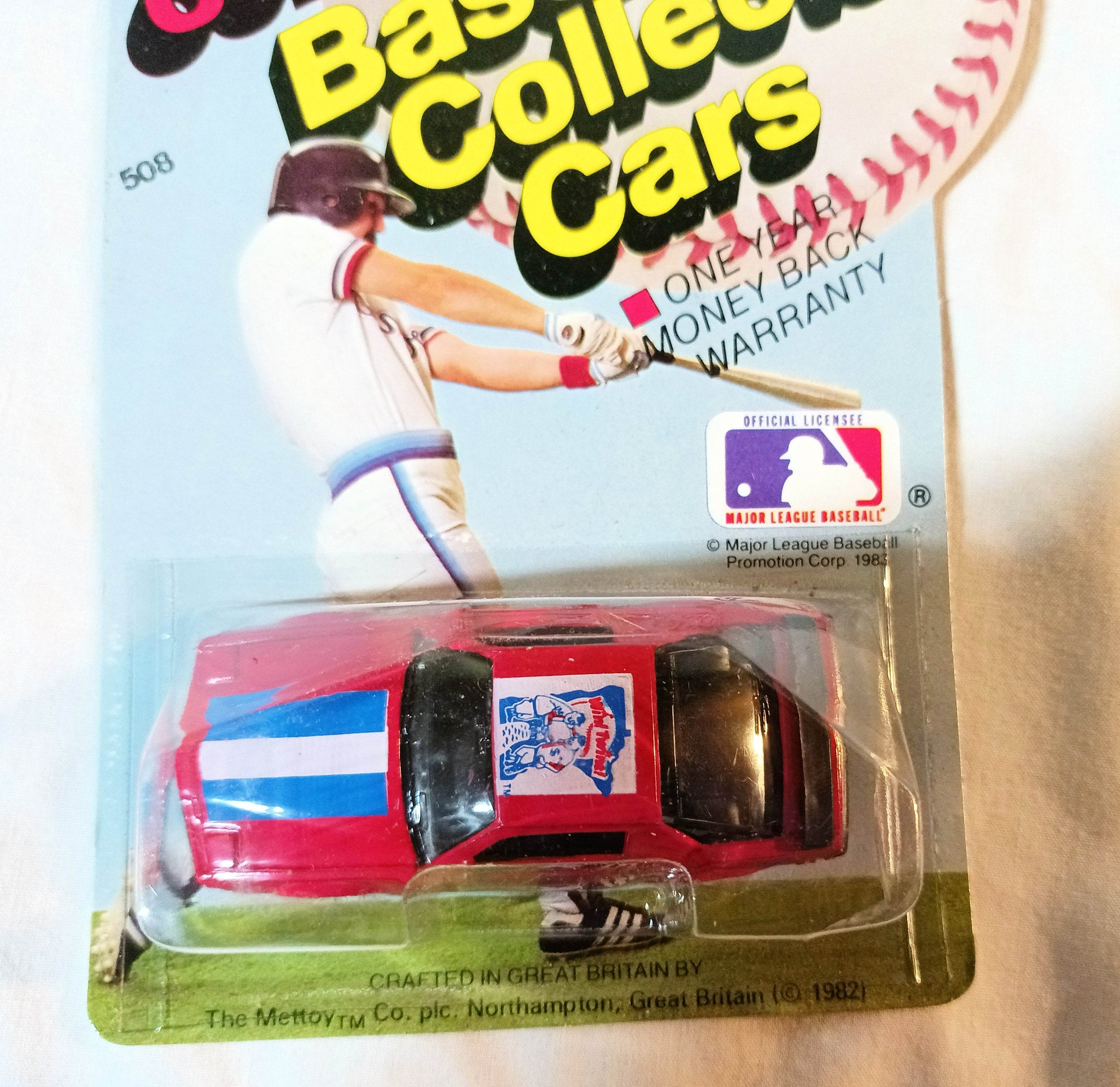 Corgi Baseball Collectors Cars 1983 edition (Corgi Juniors no. 508) diecast metal red Minnesota Twins Pontiac Firebird with clear windows, black interior, black bumpers and spoiler, black plastic base, Whizzwheels, 'Twins' tampo on doors, blue and white stripes on the hood, and Twins emblem on the roof.