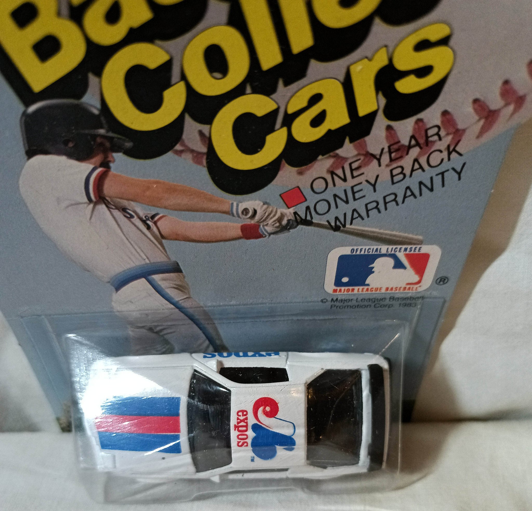 Corgi Baseball Collectors Cars 1983 edition (Corgi Juniors no. 519) diecast metal white Montreal Expos Pontiac Firebird with clear windows, black interior, black bumpers and spoiler, black plastic base, Whizzwheels, 'Expos' tampo on doors, blue and red stripes on the hood, and Expos emblem on the roof.