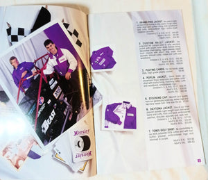 The catalog features future NASCAR racing superstar Jeff Gordon on the cover, and Gordon appears on several of the pages modeling Hoosier apparel. Gordon was just 20 years old and a rookie NASCAR driver when he appeared in this catalog. From page 7: "Jeff Gordon, 1990 USAC Midget Champion, Two Time 'Night Before The 500' Champion."
