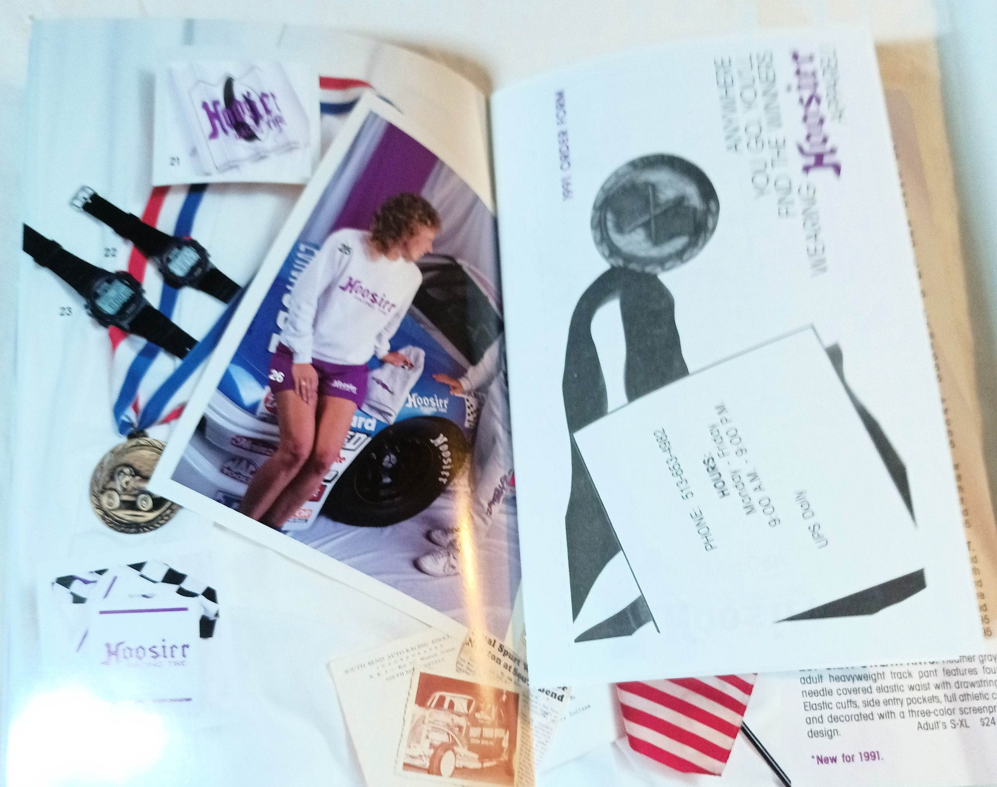 15-page full color vintage advertising catalog brochure for the 1991 Hoosier Racing Tire Apparel Catalog. The brochure was printed in the USA by Hoosier Racing Tire in 1991 and measures 8.5" x 5.5" (216mm x 140mm).