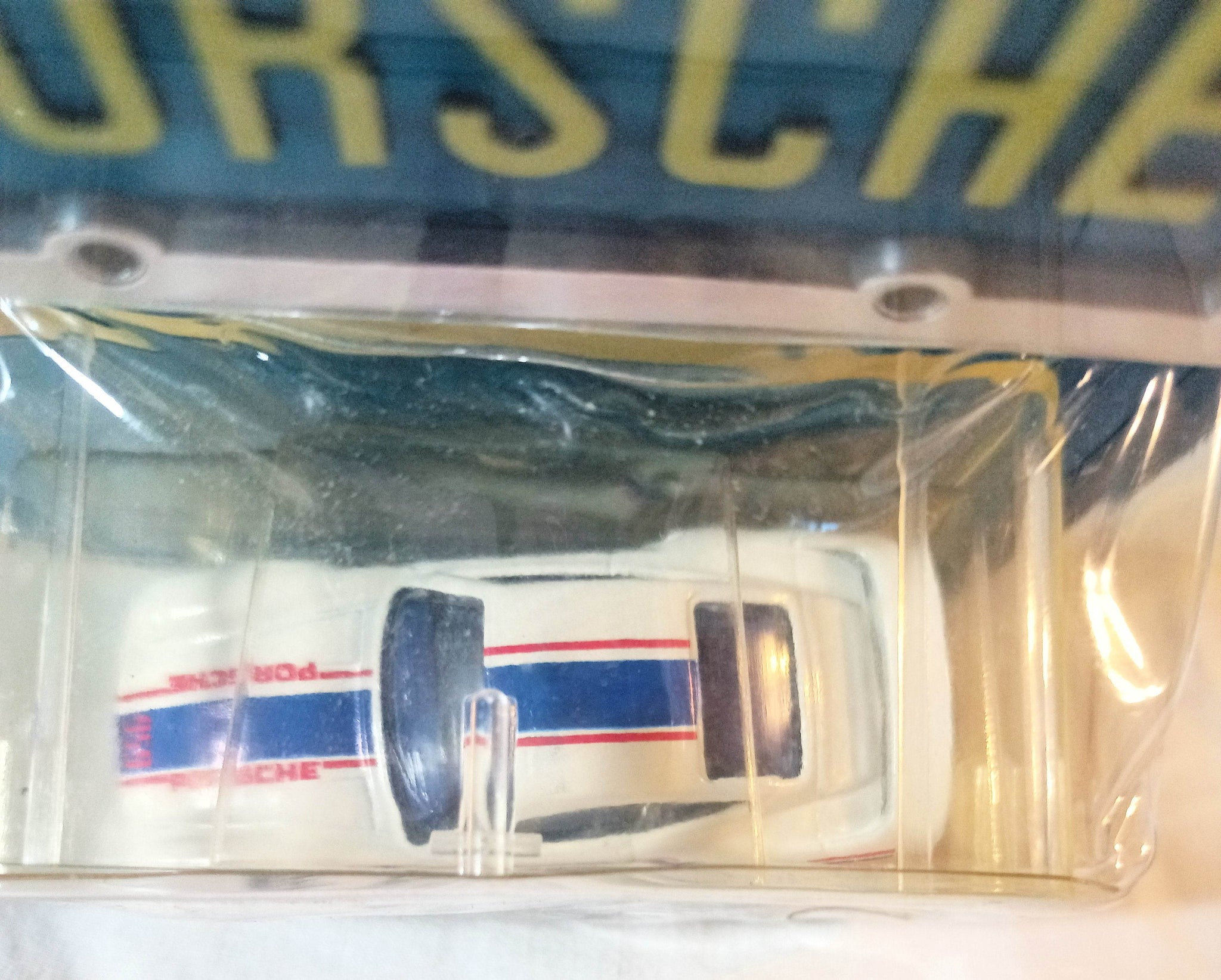 Vintage Hot Wheels “Park ’n Plates” Porsche 959 from 1989, sealed on original card with collectable license plate and hard clear plastic "garage". This is a rare variation of the Park 'n Plates Porsche with UltraHots, blue interior, and clear windows.