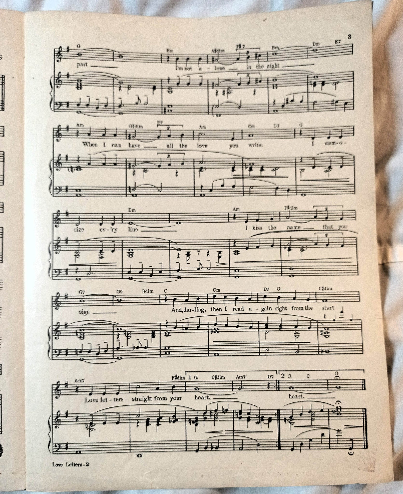 Vintage sheet music with lyrics for the song Love Letters from the 1945 Paramount Pictures movie Love Letters, lyrics by Edward Heyman and music by Victor Young.