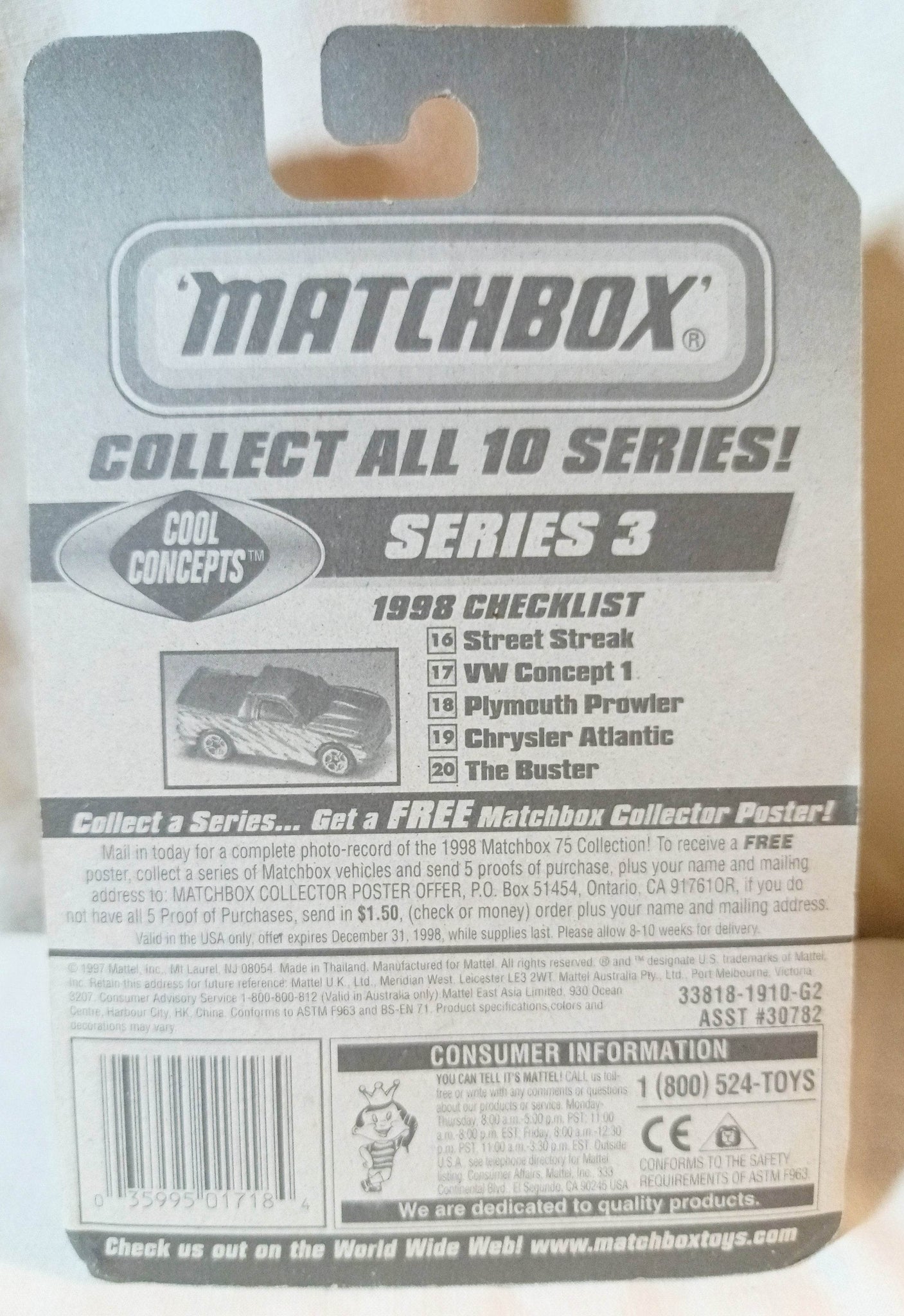 Matchbox #18, diecast metal gold Plymouth Prowler convertible concept car from the 1998 Cool Concepts series with clear windshield, black interior, black plastic base, black bumpers, and black tires with split 5 spoke chrome wheel hubs.