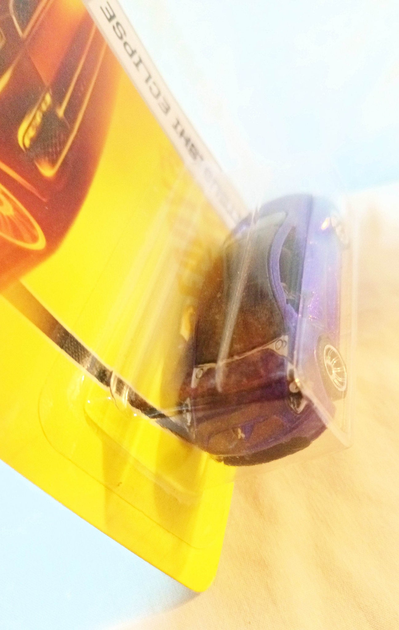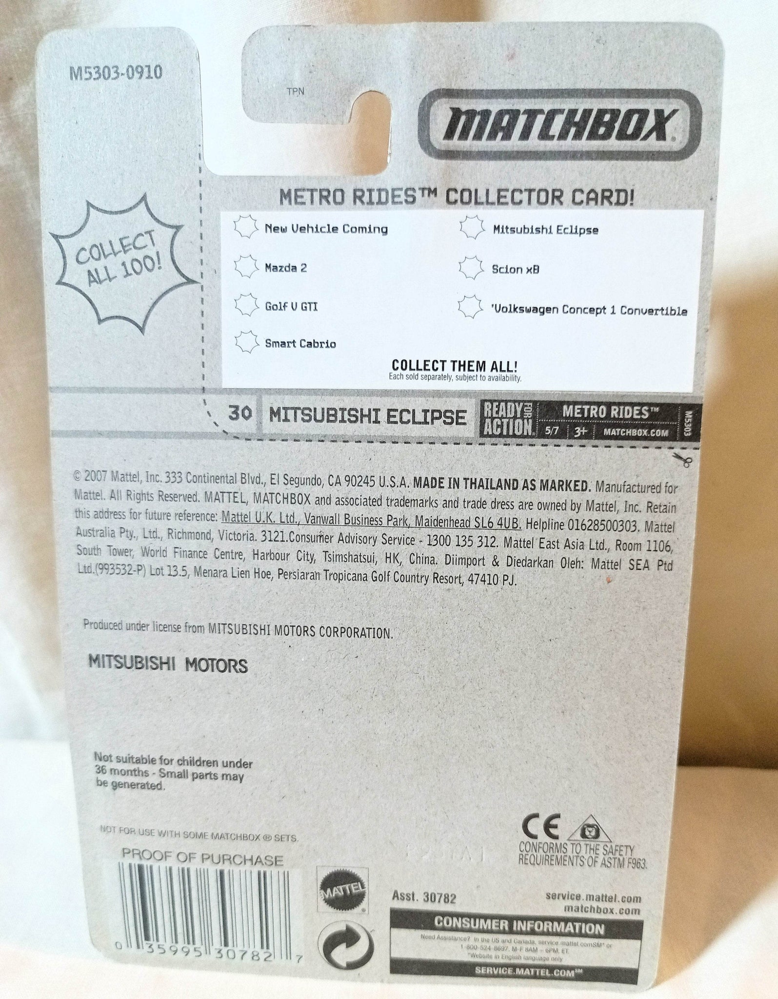 Matchbox, no. 30 (M5303) diecast metal metalflake purple Mitsubishi Eclipse compact sports car from the 2008 Matchbox Metro Rides series with smoke colored windows, gray interior, black plastic base, black roof, detailed headlight and taillights, silver accents on hood and trunk, 'Eclipse' on rear, and M002f chrome spoke wheel hubs.