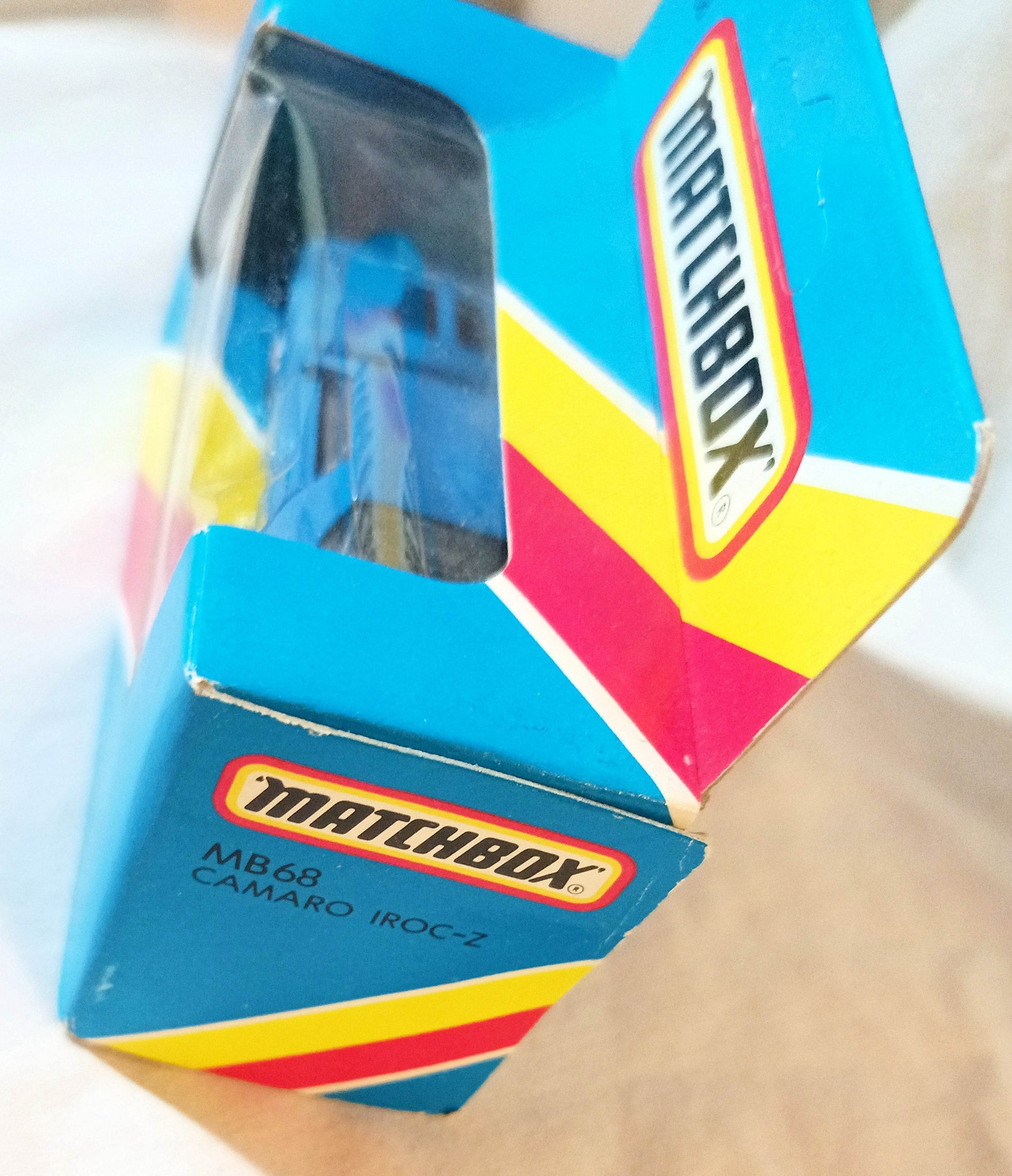 Matchbox #68 diecast metal blue Chevrolet Camaro Iroc-Z (Z28) sports car from the 1987 Matchbox line in an international box. The car has clear windows, silver/grey interior, black chassis, black hood scoops, black and white stripe design with 'Iroc-Z' on the sides, black and white design 'Iroc-Z' on hood, and black tires with 8-dot rim chrome hubs..