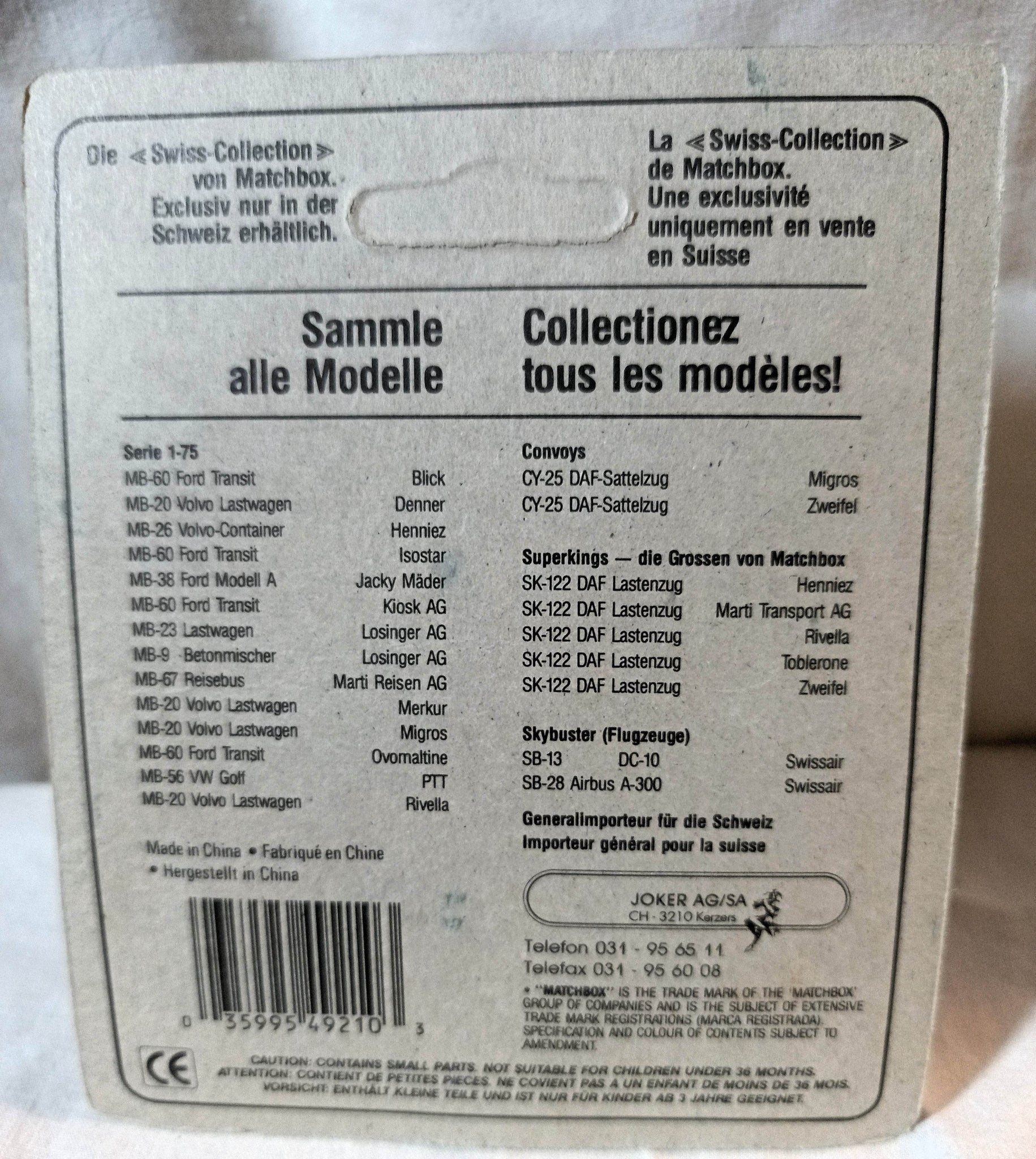 Matchbox Swiss Collection, MB60, diecast metal 1987 Ford Transit Van with orange body, clear windows, white interior,dark gray plastic base, 'Ovomaltine' labels with blue stripe on sides, white 'Wander' logo on doors and front, dark gray bumpers, clear headlights, and black tires with 8-dot chrome wheel hubs.