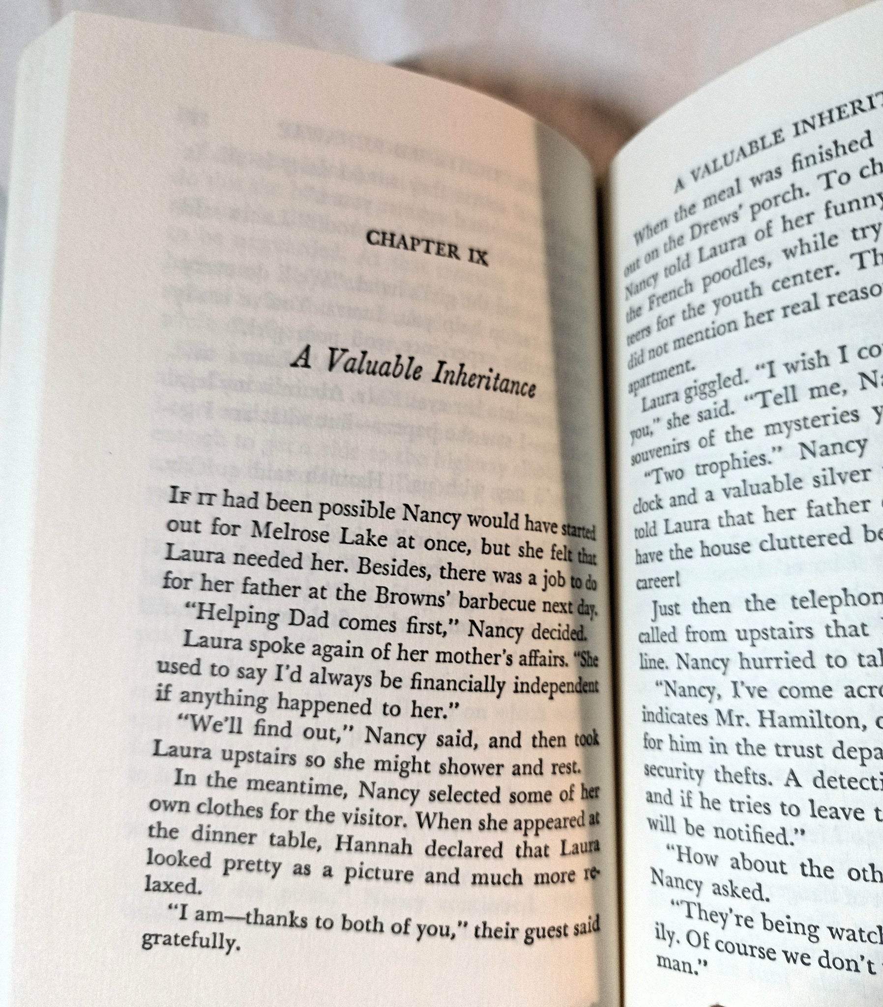 Nancy and Helen are immediately suspicious of the Aborns' intentions, finding them to be rude and untrustworthy. When Laura later escapes from her guardians, she seeks refuge at Nancy's home in River Heights. She reveals that the Aborns are not who they seem and are attempting to steal her inheritance, including a valuable collection of jewelry.