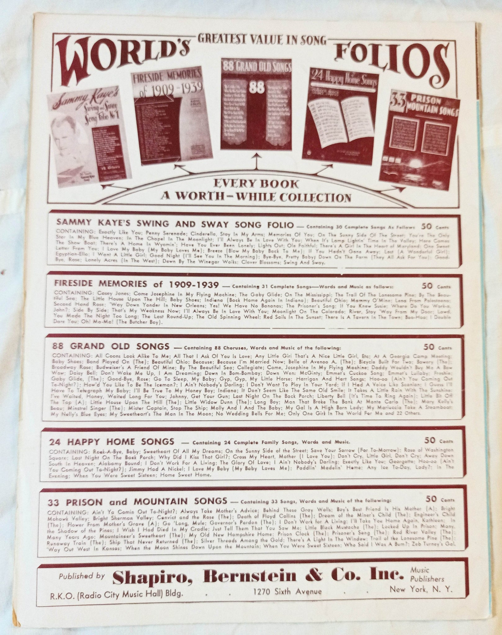 The back cover shows a list of available Shapiro Bernstein song folio shoot music books, including titles like "33 Prison and Mountain Songs", "24 Happy Home Songs", "Sammy Kaye's Swing and Sway Song Folio", and others.
