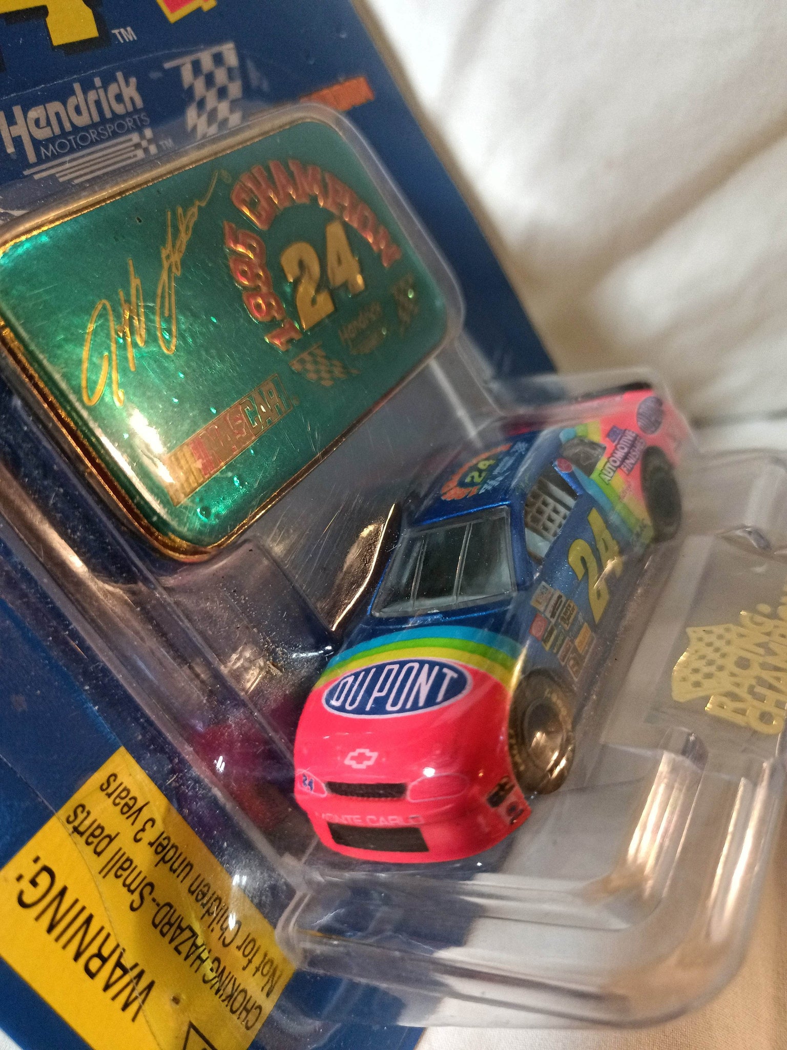 The car comes with a clear acrylic plastic display stand and a hard thick plastic badge with a gold colored metal rim that shows "Jeff Gordon NASCAR 1995 Champion #24 Hendrick Motorsports". See photos.