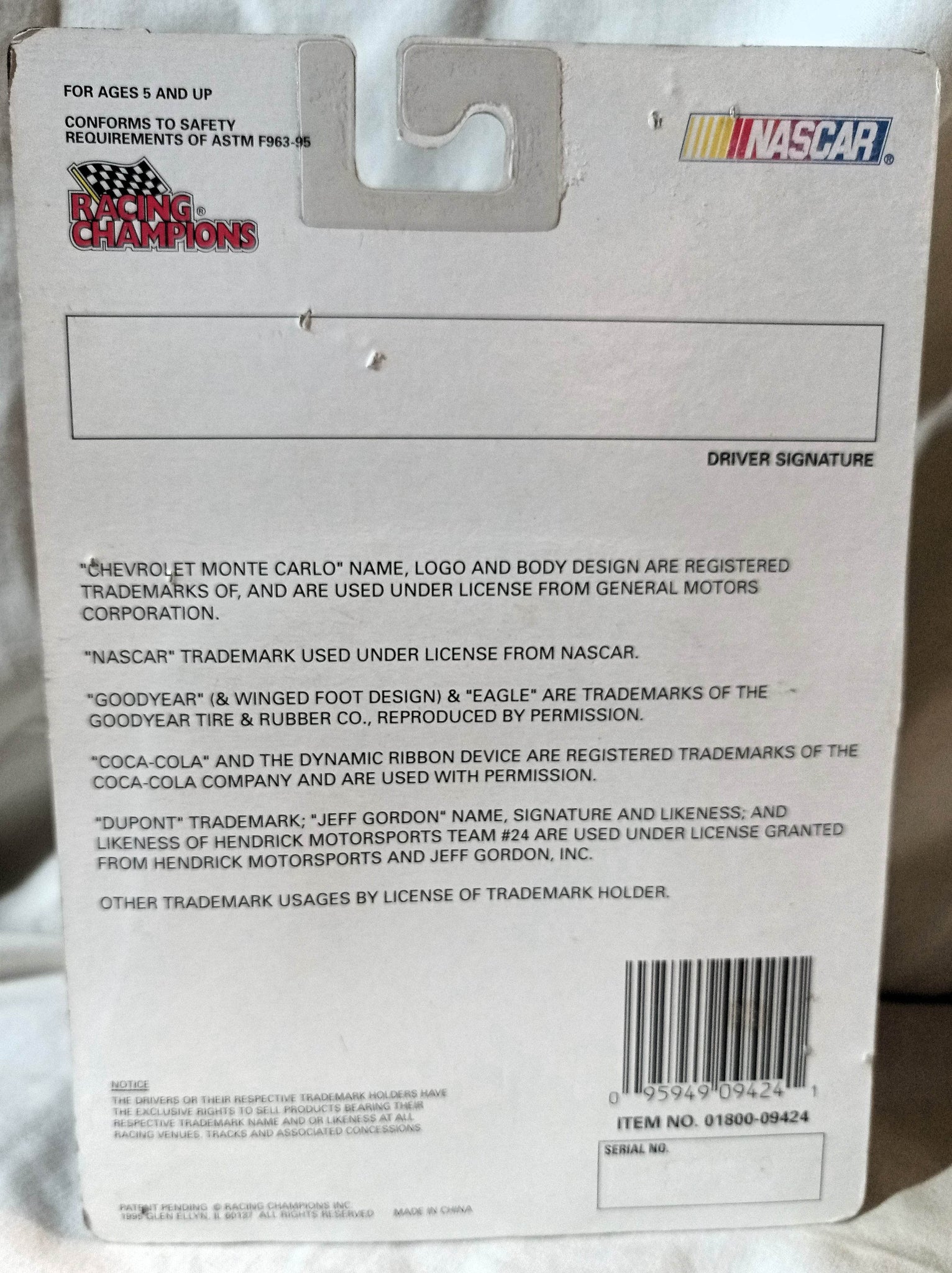 Racing Champions Nascar 1995 Champion Jeff Gordon Hendrick Motorsports #24 DuPont Chevrolet Monte Carlo stock car with multicolored orange and blue diecast body, grey plastic chassis, clear windows, grey interior, deluxe Goodyear Eagle tires, DuPont logos on hood and sides, '1995 Champion 24 Hendrick Motorsports' tampo on roof, '24' tampos on sides, racing tampos on sides, and 'Coca-Cola' logo on the trunk.
