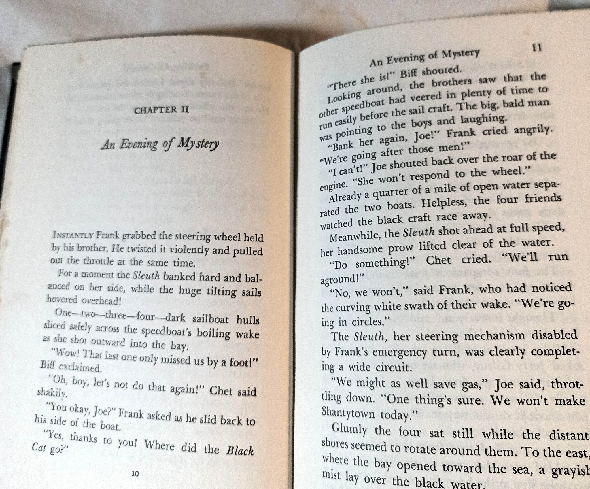 Soon after, their close friends, Chet Morton and Biff Hooper, disappear while on a motorboat trip. The boys suspect foul play and begin a search, believing the disappearance may be connected to a gang of bank robbers that their detective father, Fenton Hardy, is also tracking.