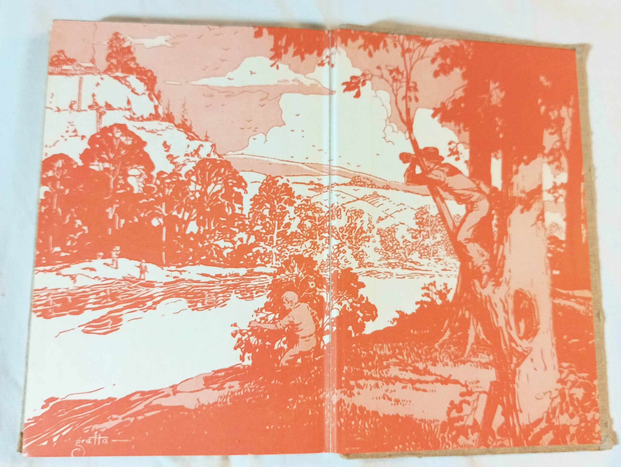 The 1952 printing has orange and white Greta endpapers.