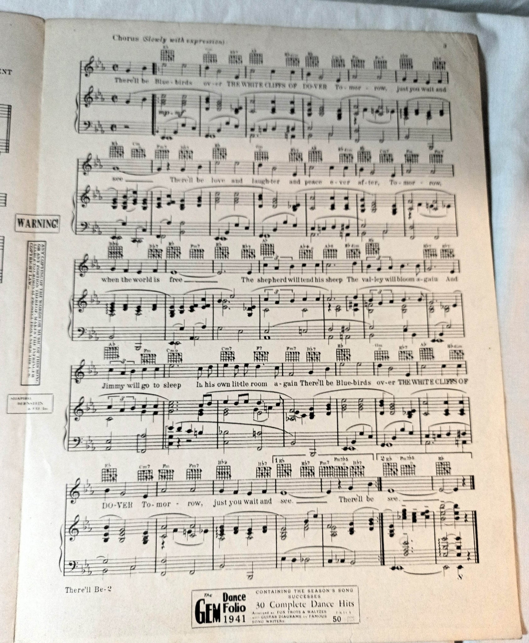 Vintage sheet music with lyrics for the 1941 song (There'll Be Blue Birds Over) The White Cliffs Of Dover, music by Walter Kent and lyrics by Nat Burton