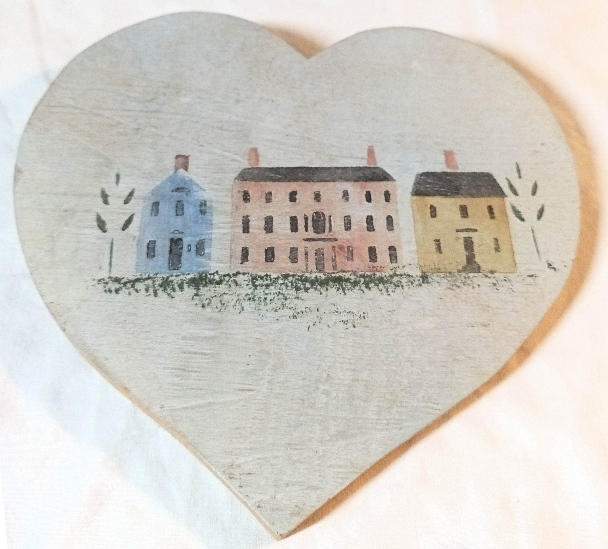 Christopher Gurshin Folk Art Wooden Heart Plaque – Early 1980s Primitive New England Houses Painting signed w/ artist's Pig Stamp